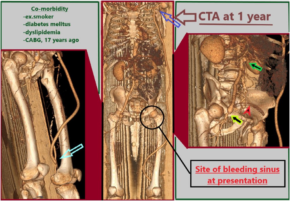 A 59-year-old-male transferred from a local hospital with a bleeding sinus at his left groin, controlled with external bandaging. He underwent at another hospital a femorofemoral bypass due to left leg claudication, five years ago, an aortobifemoral bypass 3 years ago, a graft extension of the left limb to profunda, 1 year ago, for thrombotic complications. Postoperatively, a left groin infection was treated with debridement leading to a draining sinus. Eventually, a massive bleeding occurred through this sinus, six months later. The patient transferred to our hospital and expeditiously to the operating theater after a computed tomography angiography (fig 1). The sinus was excised and a ruptured pseudoaneurysm was found. Segments of the existing thrombosed grafts were removed and the orifices of the deep profunda femoris artery were sutured from within, as they were the source of bleeding. The wound was packed with iodinated gausses and isolated with adhesive drape. The skin was sterilized again, and the patient underwent an axillary-popliteal bypass. Cultures isolated Acinetobacter baumannii. He received Daptomycin 500mg o.d. (replaced eventually with Vancomycin 1gr b.i.d due to raising creatine phosphokinase levels) and minocycline 100mg b.i.d. He had an uneventful recovery, discharged on 33rd postoperative day under ciprofloxacin 500mg b.i.d., minocycline 100mg b.i.d., rivaroxaban 20mg o.d. and acetylsalicylic acid 100 mg o.d. He remains asymptomatic, with palpable pedal pulses, 1 year later (fig 2)…..