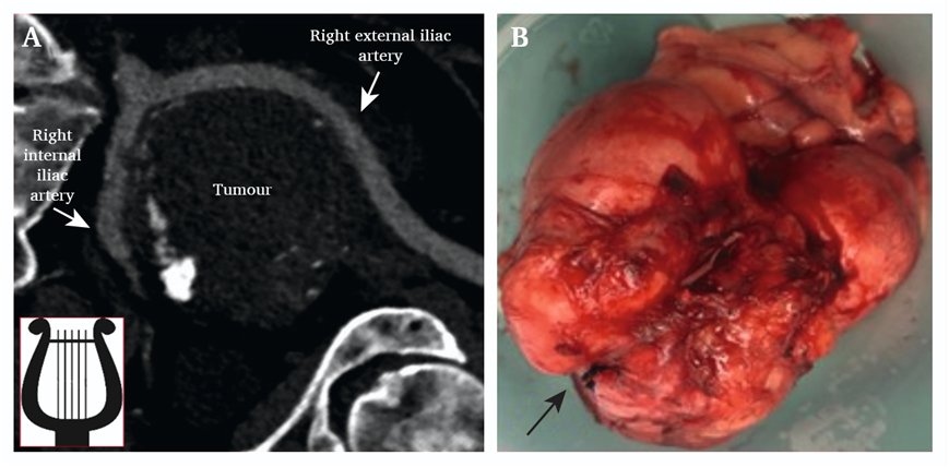 A 59 year old woman was admitted with a pelvic liposarcoma (without metastases) splaying the right external and internal iliac arteries, forming a reversed ‘Lyre sign’ (A). Through midline laparotomy, the common and external iliac arteries were looped, and the external iliac artery was freed from the tumour. The tumour was successfully resected (including local lymphadenectomy) along with the external iliac vein (B, black arrow), as it was infiltrated. Despite the use of compressive stockings and prophylactic low molecular weight heparin administration, the patient developed post-operative deep venous thrombosis, which was treated with rivaroxaban. Adjuvant chemoradiotherapy and radiotherapy is planned.
