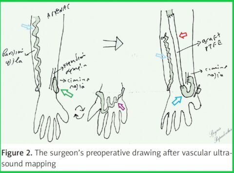 A 49-year-old female patient on chronic dialysis for the last 13 years was referred for a dysfunctional left side-to-side Brescia-Cimino fistula created in another institution, 14 years previously. She had a history of nephrectomy after a severe traumatic injury at the age of 16. Her medication included clopidogrel 75 mg o.d., omeprazole 20 mg o.d. and sevelamer carbonate 800 mg, 2 tbs t.i.d. The efferent cephalic vein was thrombosed, and cannulation was impossible via a serpentine and kinked basilic vein in the forearm. Hemodialysis was performed by a permanent tunneled catheter placed in the right jugular vein. After a color duplex ultrasound evaluation, forearm cephalic vein thrombosis was confirmed, but the fistula functioned via the patent afferent wrist cephalic vein. This vein was draining in the forearm basilic vein, through a dilated venous network at the dorsal aspect of the hand. The flow volume was 700 ml/min. Deep veins were patent. This anatomic venous configuration resembles the venous outflow of an ulnarbasilic vein (Figure 1). Preoperative percutaneous digital subtraction venography revealed normal patency of the upper arm cephalic, basilic, and central veins. The patient underwent interposition of a synthetic 4–7 mm graft